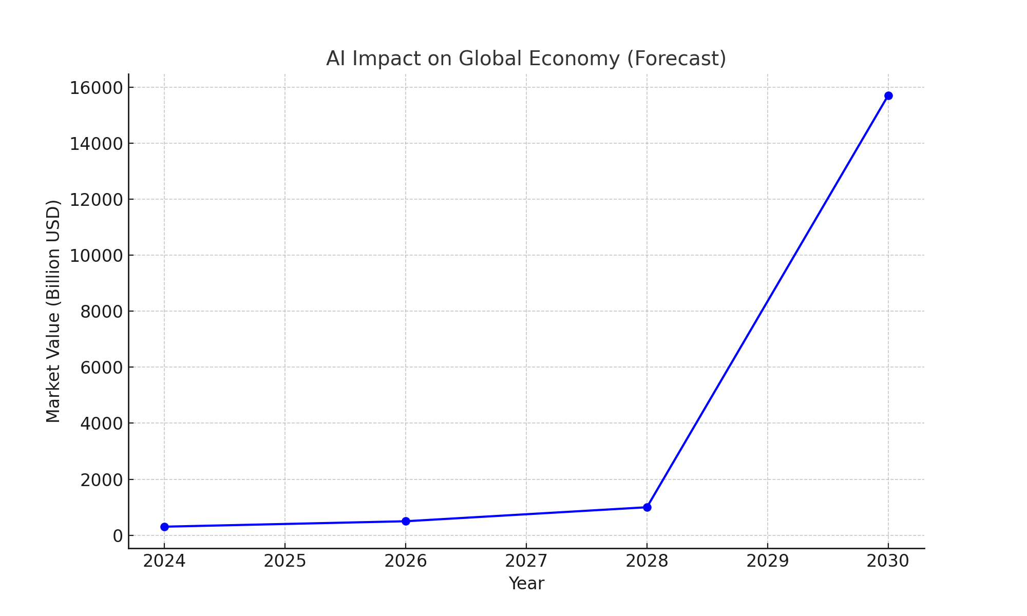 The economic impact of these transformations will be substantial. Graph 7 shows the forecasted AI impact on the global economy, with a projected contribution of $15.7 trillion by 2030. This growth curve indicates not just a technological shift, but a fundamental economic transformation driven by AI integration across all sectors.