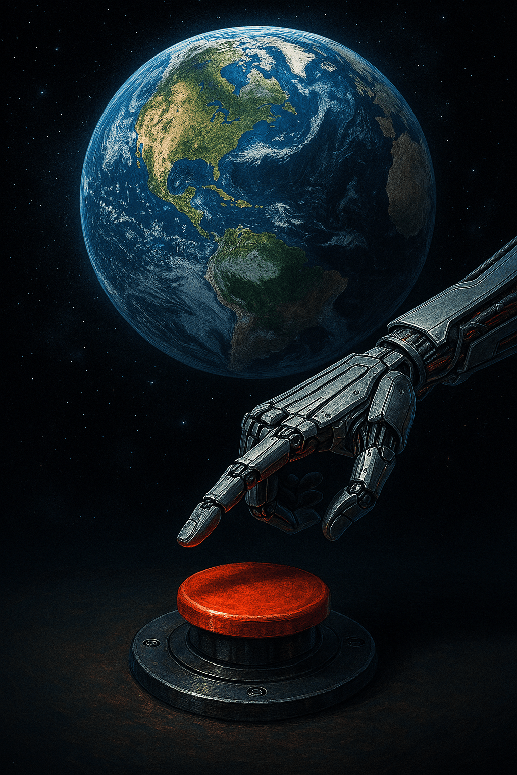 As we conclude this series of reports, I invite you to reflect upon the image accompanying these words: a mechanical hand suspended ominously above a glowing red button, with Earth—our shared home—floating quietly in the vast expanse of space. This visual is both striking and unsettling.