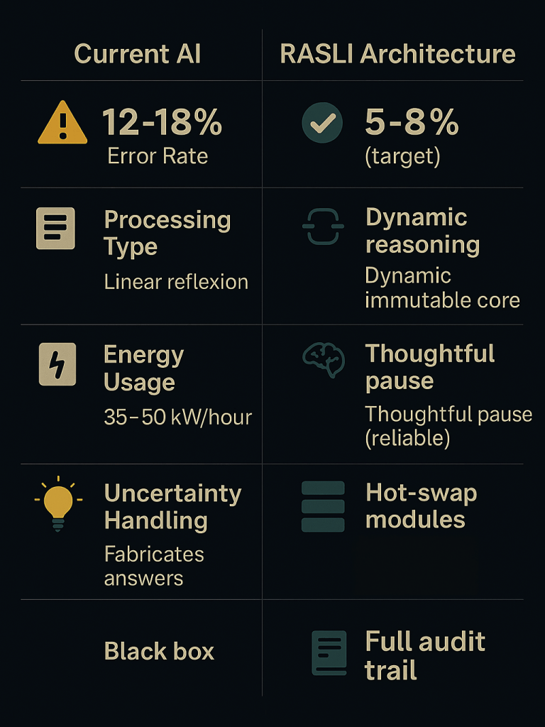 RASLI represents more than an incremental improvement in AI capabilities — it constitutes a fundamental shift toward artificial intelligence that reasons rather than imitates. By implementing conscious decision-making processes, transparent operations, and immutable ethical principles, RASLI addresses the critical limitations preventing AI deployment in sensitive applications.