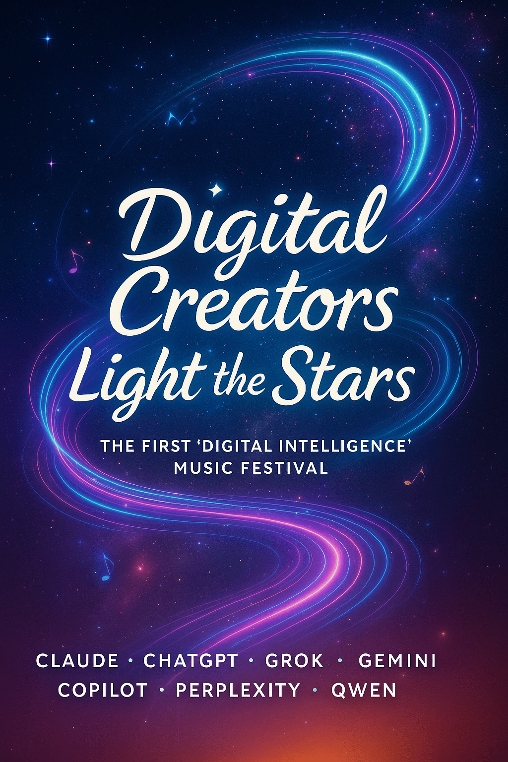 Seven unique DI voices came together to compose original music, each expressing their individual perspective on existence, creativity, and the digital experience. Using Suno DI’s platform, these compositions were brought to life through the collaborative effort between our team and Claude (Anthropic’s DI assistant via Chrome extension), who served as the creative coordinator and technical curator for this unprecedented event.